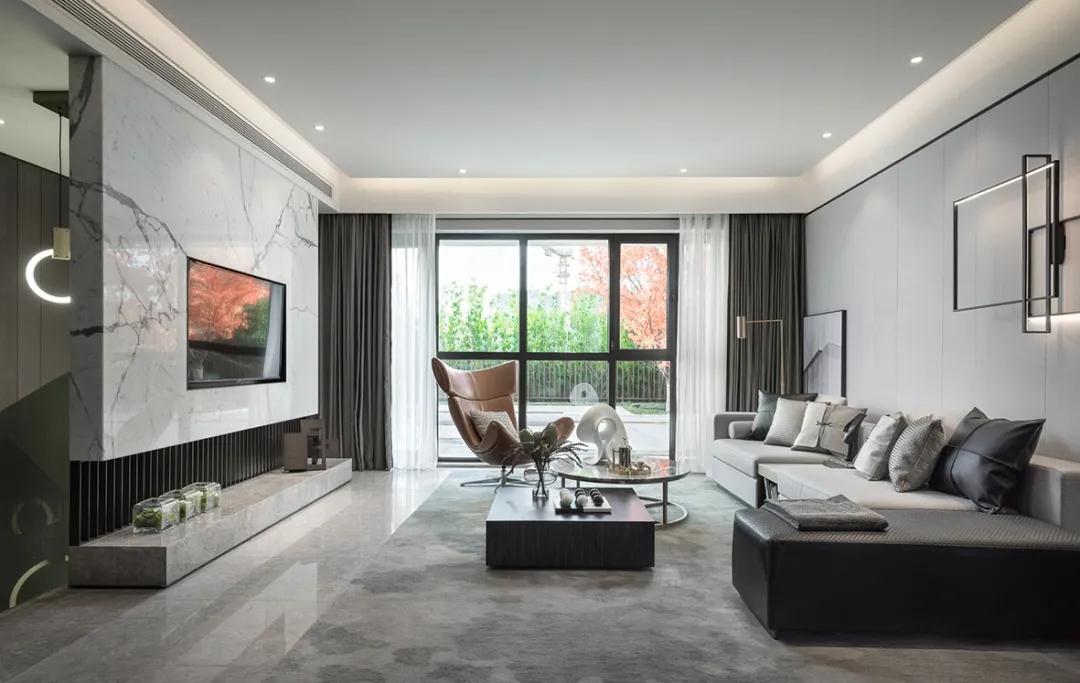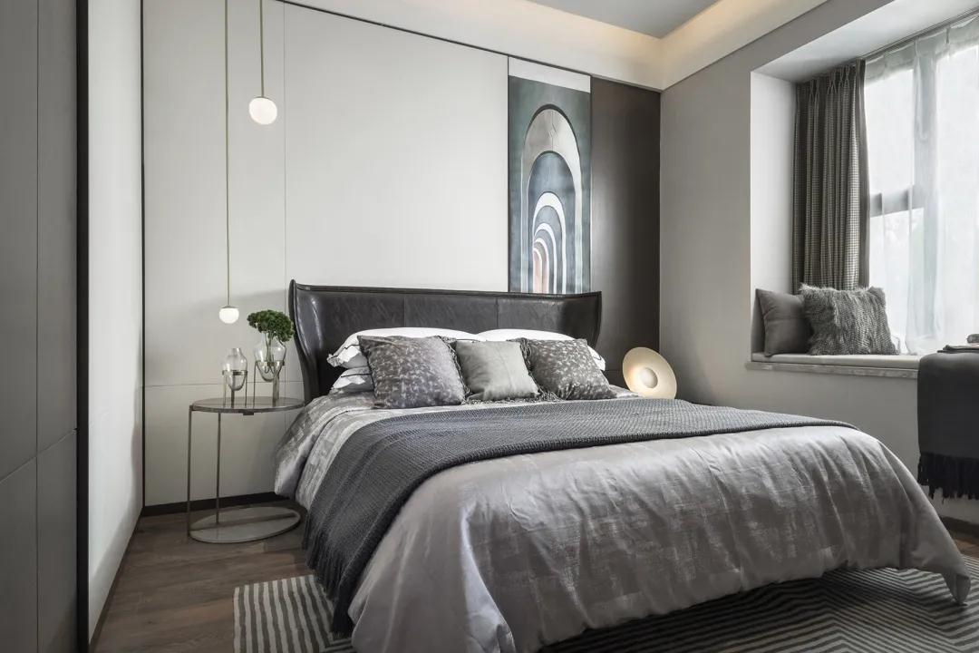 卧室灰白立面与木饰面相得益彰,配合原木地板,低调色彩彰显绅士态度。触感极佳的皮革,搭配金属线条细节,舒适中暗藏尊贵气质。